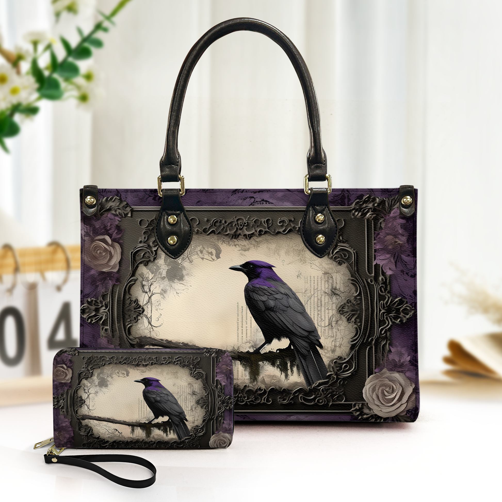 Gothic Raven Leather Handbag & Wallet Set – Inspired by Edgar Allan Poe