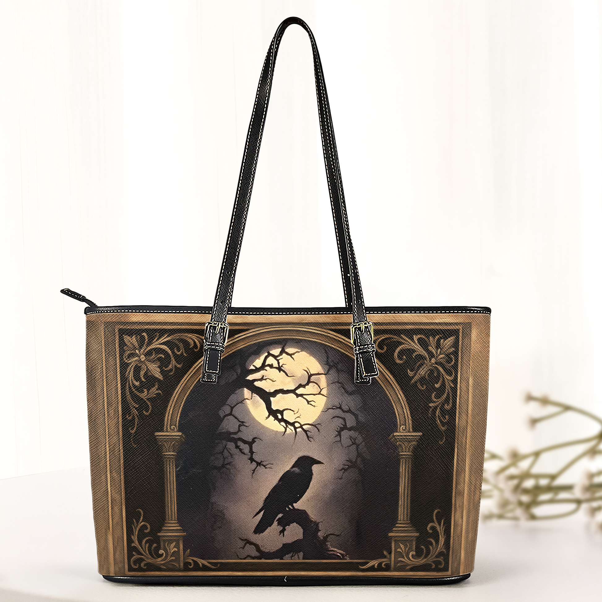 Inspired by the quiet power of the night, this handbag features a raven beneath the moon, symbolizing mystery, wisdom, and individuality. The gothic art design creates a bold yet elegant statement for those who embrace a darker, artistic style.