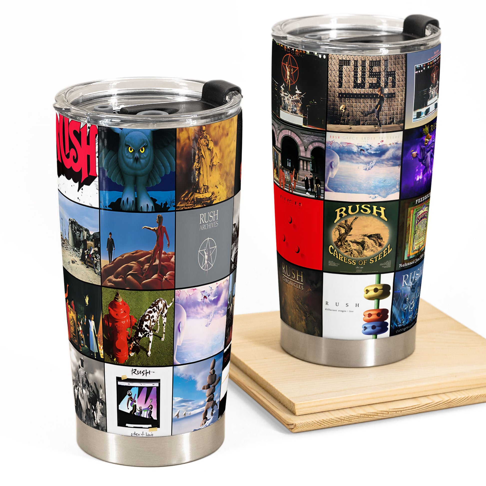Rush Album Collage Tumbler – A Progressive Rock Nostalgia Tribute